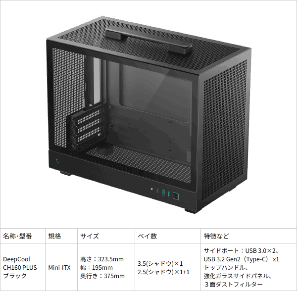 前面 I/F:USB Type-A x2 (USB 3.0) / USB Type-C x1 (USB 3.2 Gen 2) / オーディオ In-Out x1 搭載ファン:トップ : 120mm x1 / リア : 120mm x1 サイズ(高さ x 幅 x 奥行) : 462.8 x 266 x 266 / 重量 : 6.1kg 取付制限:mini-ITX 規格のマザーボードのみ、空冷CPUクーラーのみ(水冷不可) |