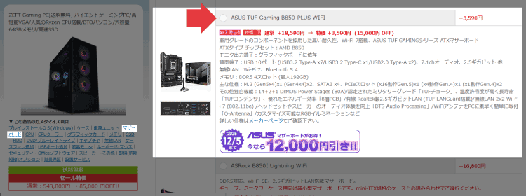 各商品のカスタマイズ画面から対象のマザーボードを選択してください。